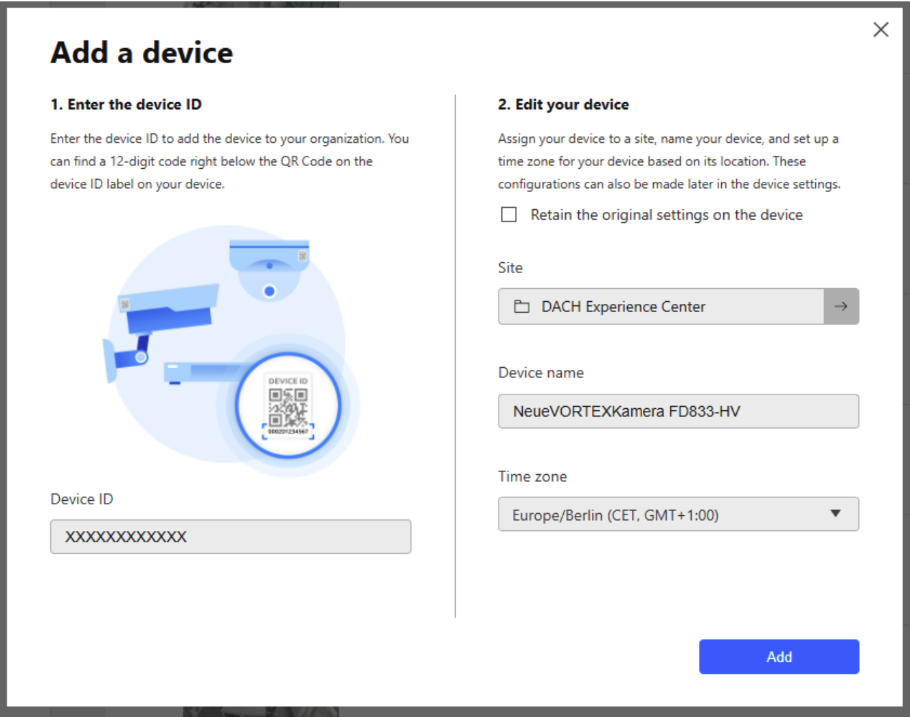 Tragen Sie hierbei nun die Seriennummer der Kamera ein, vergeben einen Namen und fügen die Kamera einer "Site" hinzu.