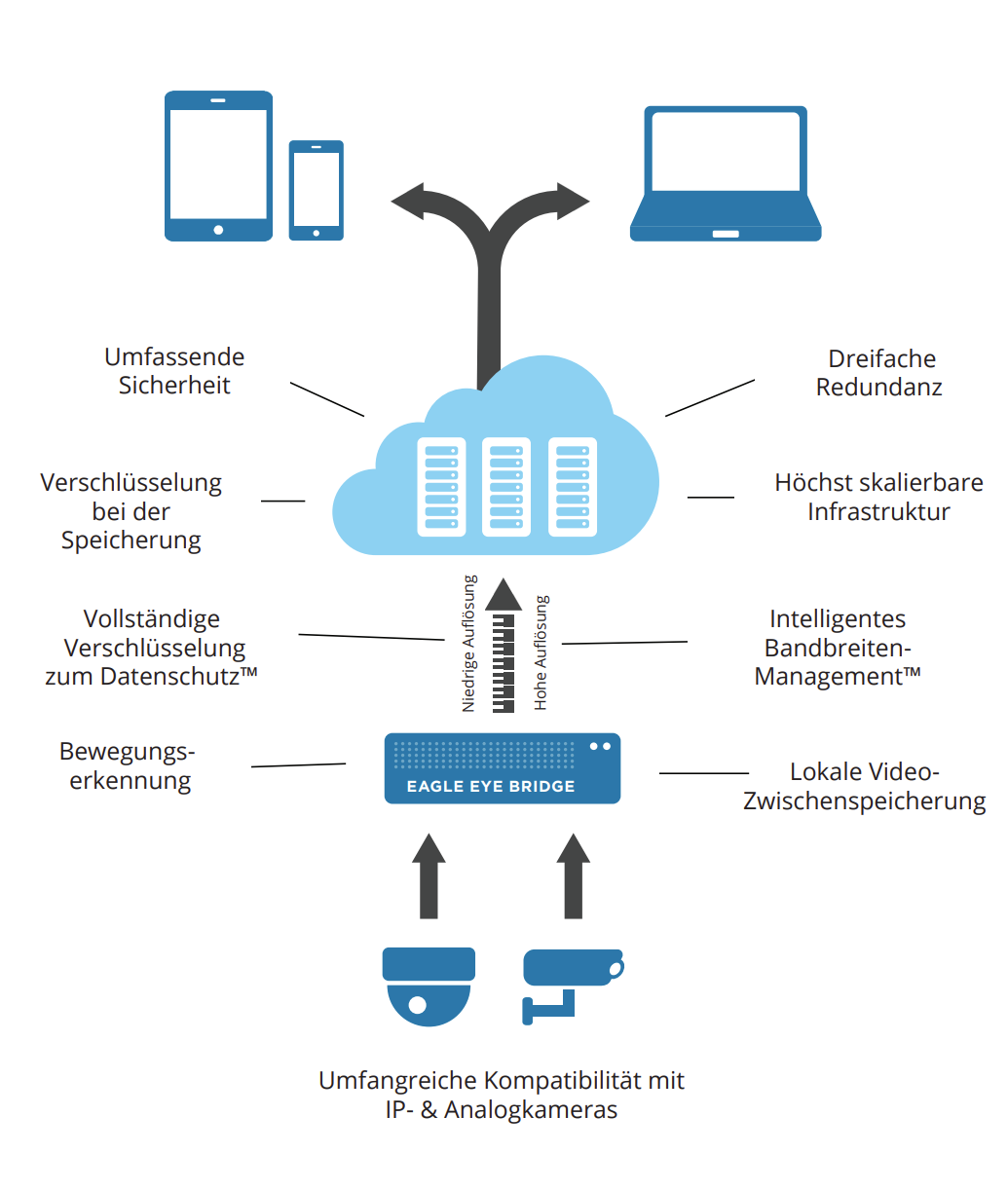 Mit dem Eagle Eye Cloud VMS ist der Zugriff auf aufgezeichnete und Echtzeitvideos einfach und erfordert keine zusätzliche Software. Unsere Cloud-basierte Lösung reduziert die lokale Hardwarebelastung, da die Verarbeitung in der Cloud erfolgt. Dadurch können auch einfache PCs/Clients verwendet werden.
