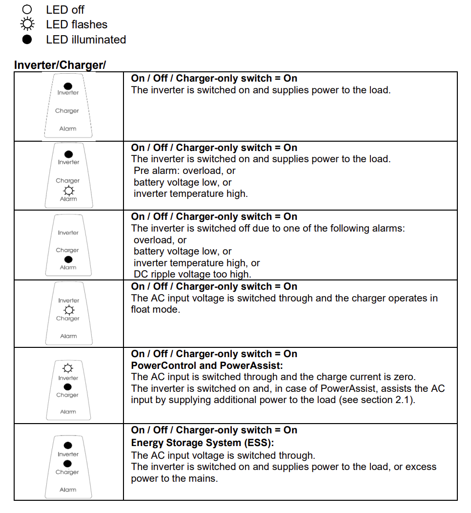 Wenn der Schalter auf „Charger only“ gestellt ist, arbeitet ausschließlich das Batterieladegerät des Multi (sofern Netzspannung vorhanden ist). In diesem Modus wird die Eingangsspannung ebenfalls zum Anschluss „AC out“ durchgeschaltet.