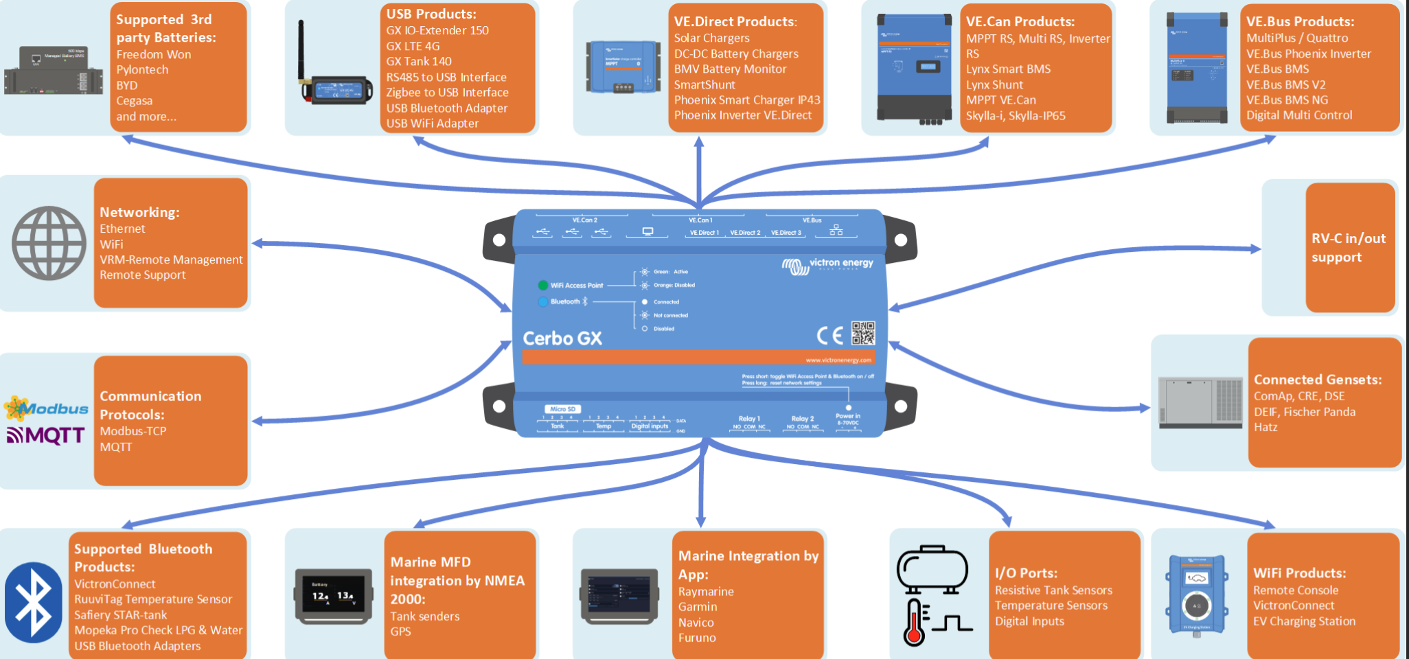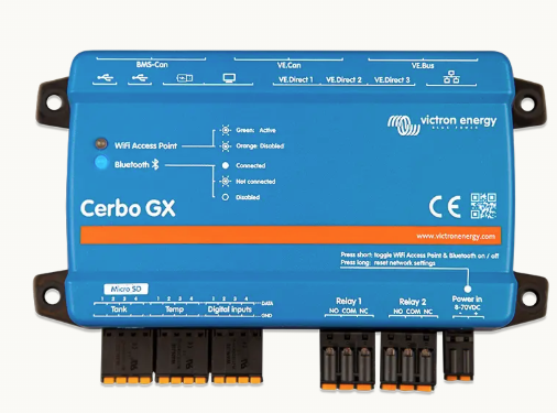 Der Cerbo GX ist das zentrale Steuer- und Überwachungsgerät für das Victron-Energiesystem. Er sammelt und steuert Daten von Wechselrichtern, Ladegeräten, Shunts, Batterien, Solarladereglern etc. und kann über LAN/Wi-Fi/Remote-Portal ferngesteuert werden.