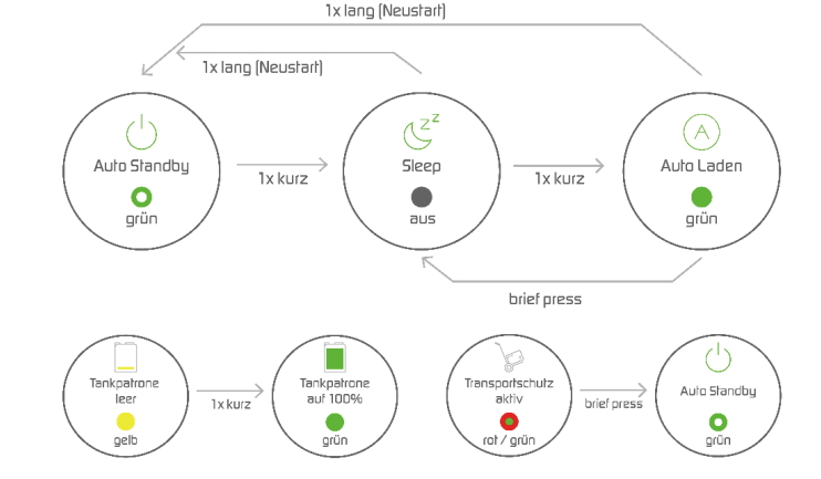 Schema zur Bedienung des Tasters: 1 x kurzes Drücken (< 1 Sekunde) wechselt zwischen den Betriebsmodi, 1 x langes Drücken (> 5 Sekunden) führt einen Reset durch.